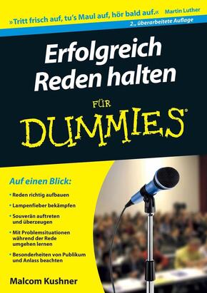 Für manch einen Zeitgenossen rangiert eine Wurzelbehandlung ohne Narkose in der nach unten offenen Beliebtheitsskala noch über einer Rede vor Publikum. Dabei ist Reden eigentlich gar nicht so schlimm und kann, wenn man es beherrscht, sogar Spaß machen. Aber egal, wie man zu dem Thema steht, fast jeder kommt irgendwann in eine Situation in der er eine öffentliche Rede halten muss, sei es bei der Arbeit, im Verein oder bei einer Familienfeier. Malcolm Kushner zeigt den Lesern, wie sie eine Rede richtig aufbauen, was sie bei ihrer Körpersprache beachten sollen und wie sie am besten mit Krisensituationen während einer Rede umgehen. So nimmt er mit »Erfolgreich Reden halten für Dummies« Anfängern die Angst vor der Blamage und hat auch für erfahrene Redner noch den einen oder anderen Kniff parat.